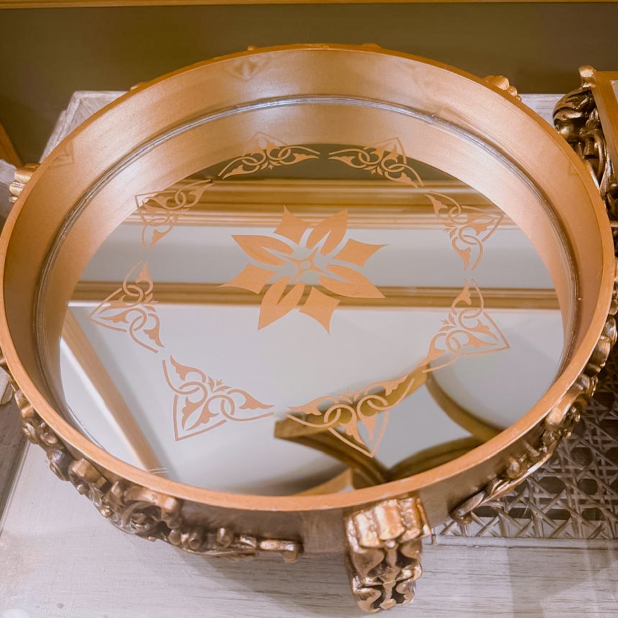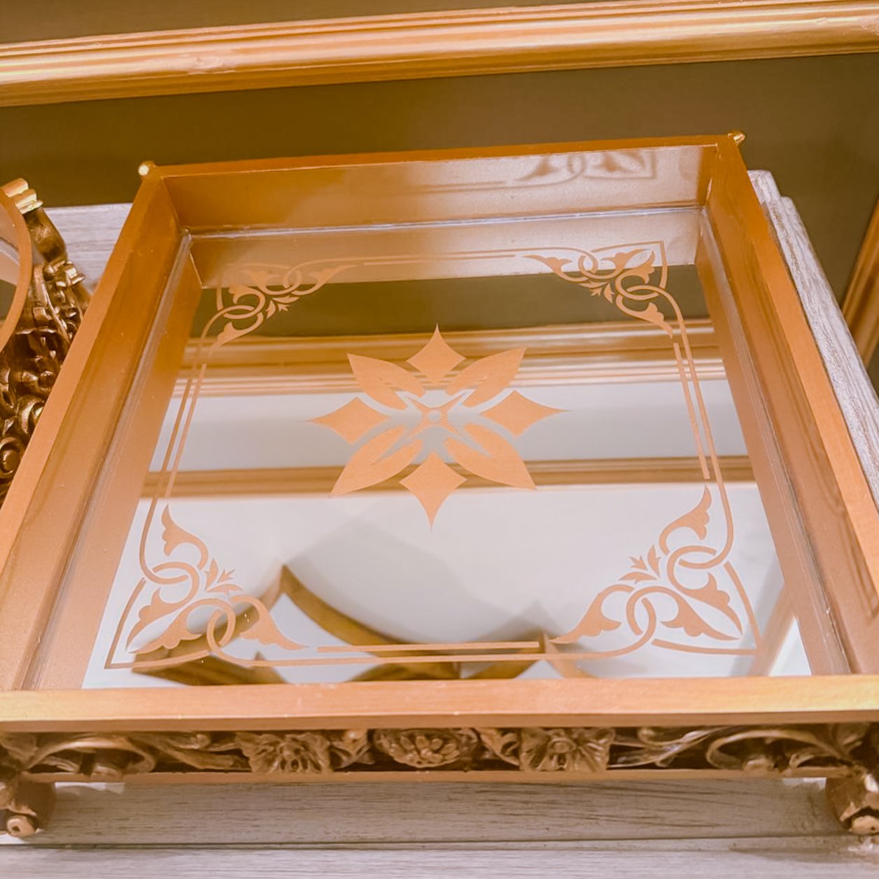 Beautifully crafted trays featuring delicate wooden carvings and a laser-printed mirror surface. These trays combine tradition with contemporary design, making them excellent for gifting or décor.